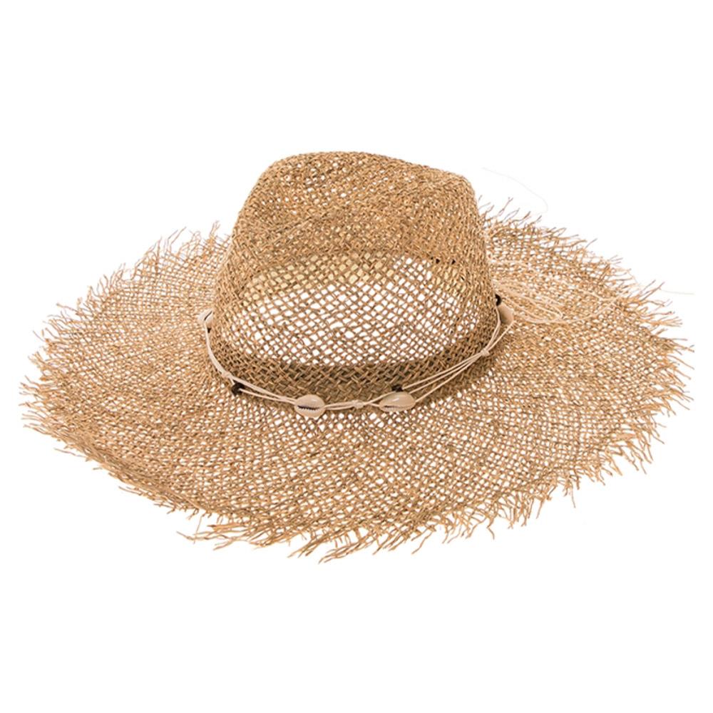 FRAYED EDGE SEAGRASS PANAMA HAT W/ SEASHELLS & WOOD BEADS BAND
