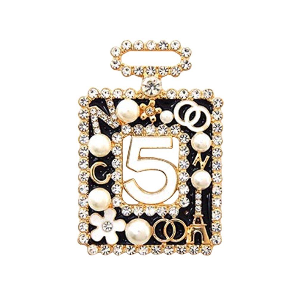 PERFUME-BOTTLE-SHAPED BROOCH  A RHINESTONE FRAME, THE  NUMBER "5" IN THE CENTER, AND SMALL EMBELLISHMENTS  INCLUDING PEARLS, FLOWERS, AND THE EIFFEL TOWER  24