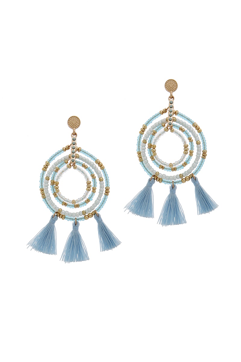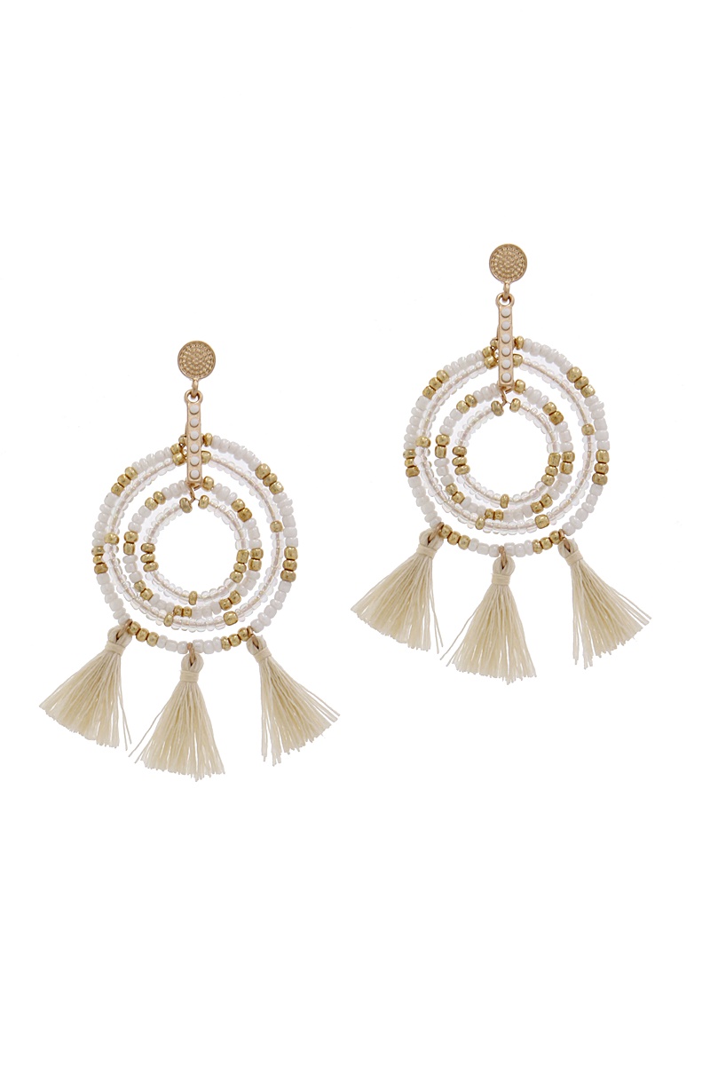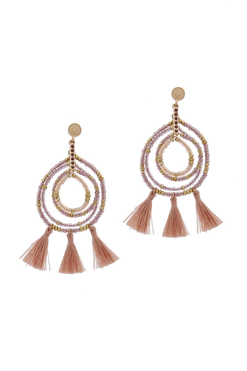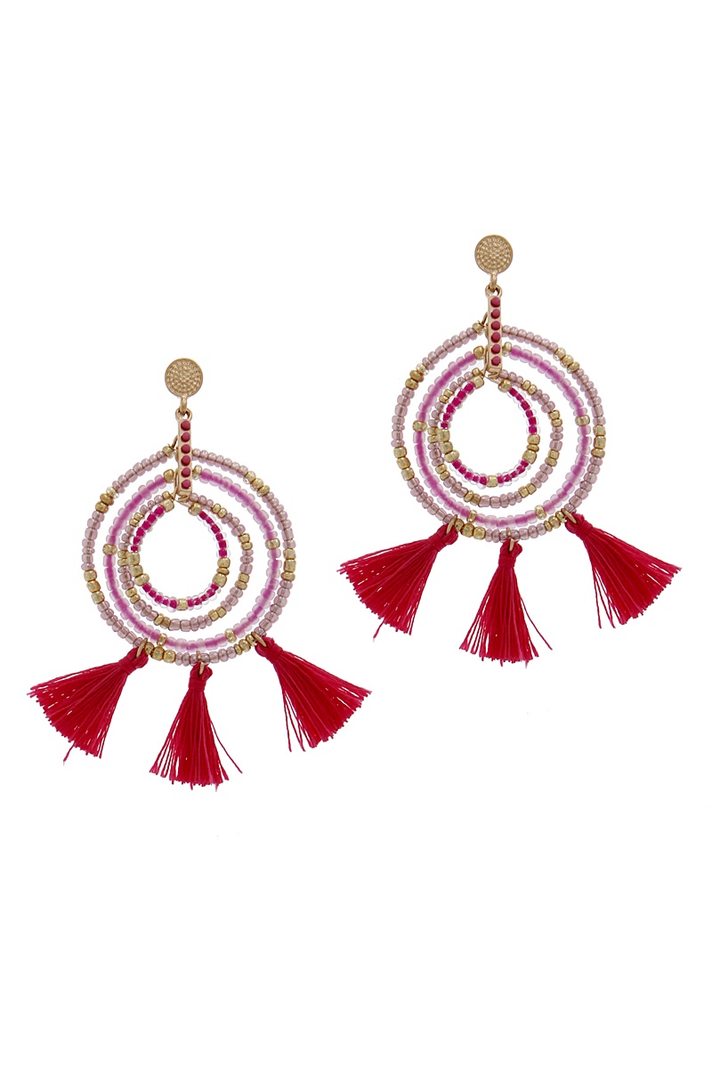 FASHION BEADED HOOP AND 5 TASSEL DROP EARRING