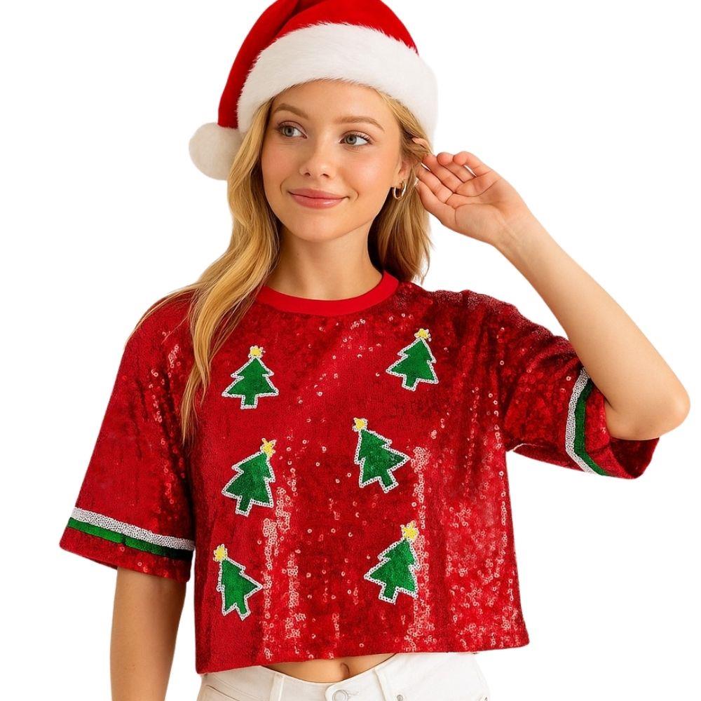 SEQUIN CHRISTMAS TREE EMBELLISHED CROP TOP