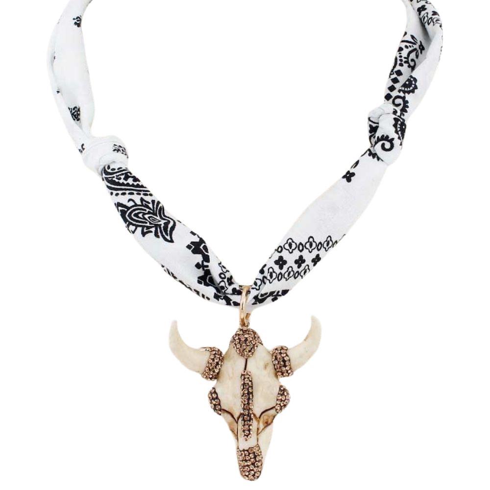 RHINESTONE CATTLE SKULL PENDANT FABRIC NECKLACE