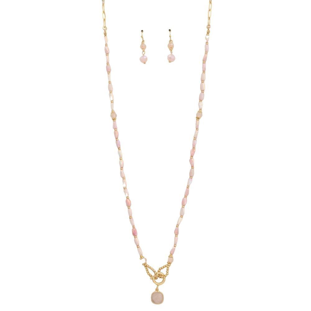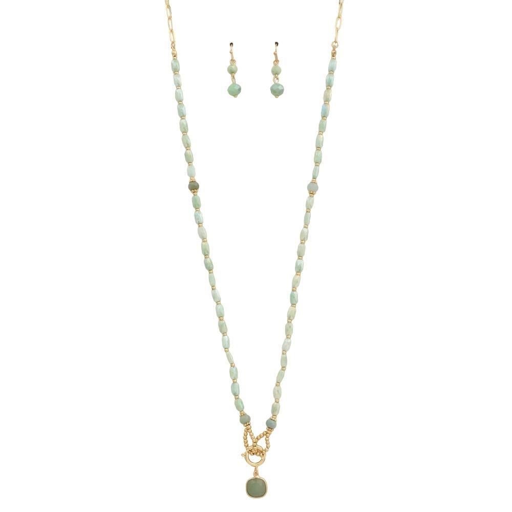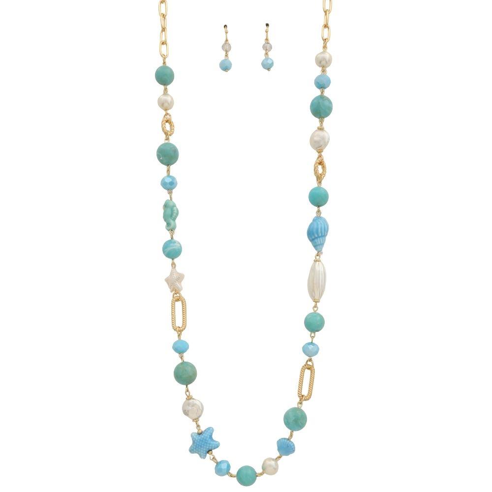 METAL STONE BEADED LONG NECKLACE EARRING SET