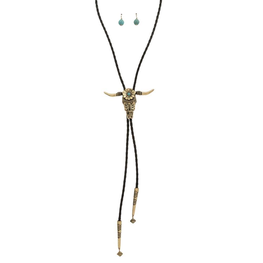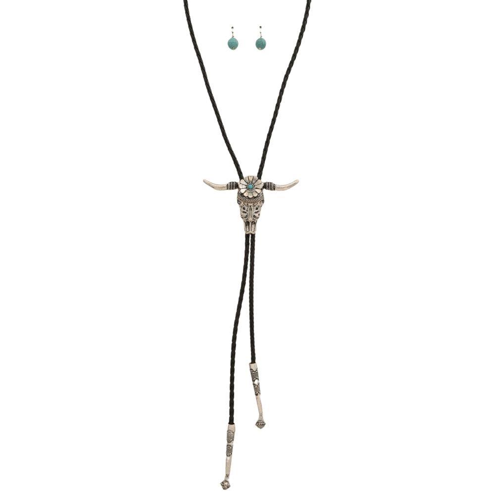 METAL BULL SKULL TURQUOISE BOLO LONG NECKLACE EARRING SET