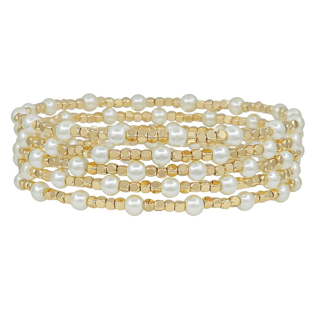 5 SET 4MM PEARL 2MM SQUARE METAL AC STRETCHED BRACELET